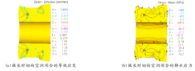 由圖4.13 (a), (b)可以看出,拔長壓下量達(dá)到21. 4%時,可鍛合軸向空洞缺陷。球形空洞缺陷閉合處等效應(yīng)變?yōu)?. 433,空洞缺陷閉合處的靜水應(yīng)力為壓應(yīng)力,大小為-54. 5MPa。由圖4.13 (c), (d)可以看出,拔長壓下量達(dá)到24. 6%時,即可鍛合軸向空洞缺陷。球形空洞缺陷閉合處等效應(yīng)變?yōu)?. 563,空洞缺陷閉合處的靜水應(yīng)力為壓應(yīng)力,大小為一33. 9MPa。