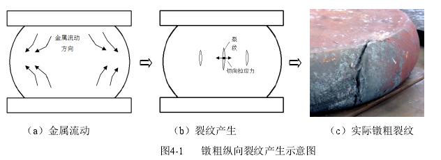裂紋是鍛造生產(chǎn)中常見的主要缺陷之一,通常是先形成微觀裂紋,再擴(kuò)展成宏觀裂紋。在鐓粗時,鍛件的中間區(qū)域的變形量大,而兩端由于受到摩擦力影響變形較小,鍛件兩端金屬向中間流動時,中間金屬受到擠壓而向外,向外流動的金屬便使金屬表面產(chǎn)生切向的附加拉應(yīng)力。在鐓粗實(shí)際過程中,由于金屬材料變形不均勻引起的金屬表面的切向拉應(yīng)力,從而容易導(dǎo)致金屬材料側(cè)表面縱向裂紋的產(chǎn)生(如圖 4-1 所示)。