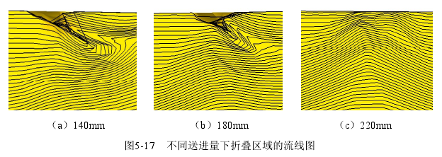 根據(jù)模擬結(jié)果,在不同送進(jìn)量下,拔長后鍛件折疊區(qū)域的流線圖如圖 5-17 所示,由流線圖可以知,在較小送進(jìn)量時,拔長過程鍛件表面產(chǎn)生嚴(yán)重的折疊現(xiàn)象;而在較大的送進(jìn)量情況下,拔長鍛件表面不會產(chǎn)生的折疊現(xiàn)象。在其他條件不變的情況下,隨著送進(jìn)量的增大,折疊會隨著逐步減小并且消失。
