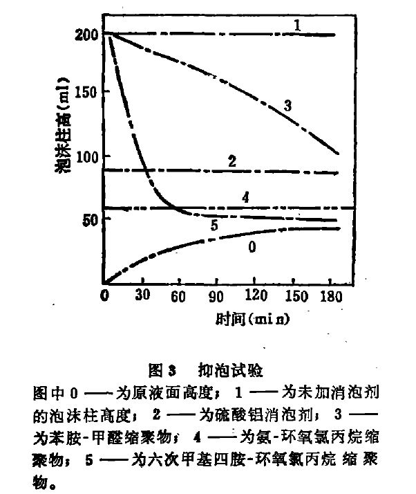 從圖3 中看出六次甲基二胺-環(huán)氧氯丙烷消泡劑的抑泡效果也最好,硫酸鋁消泡劑的消泡效果較好,但消泡效果較差。
